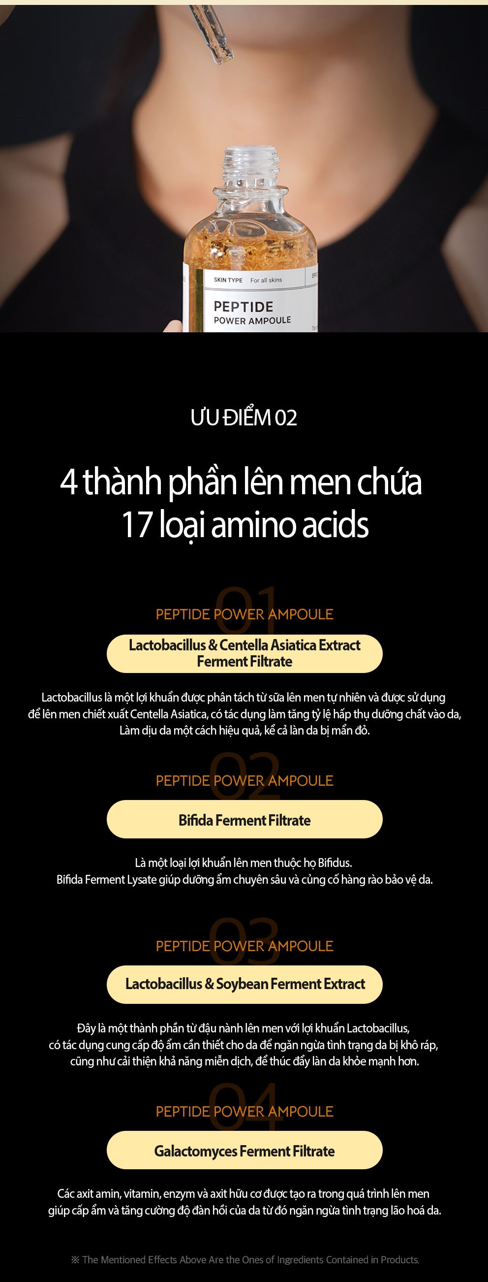 Thành phần: Water, Glycerin, Butylene Glycol, 1,2-Hexanediol, Niacinamide, Alcohol, Lactobacillus /Centella Asiatica Extract Ferment Filtrate, Bifida Ferment Filtrate, Lactobacillus/Soybean Ferment Extract, Galactomyces Ferment Filtrate, Aspartic Acid, Leucine, Alanine, Lysine, Arginine, Tyrosine, Tin Oxide, Phenylalanine, Proline, Threonine, Valine, Isoleucine, Histidine, Cysteine, Methionine, Copper Tripeptide-1(20ppm), Palmitoyl Penta peptide-4(10ppm), Acetyl Hexapeptide-8(10ppm), Palmitoyl Tripeptide-165 ppm), Palmitoyl Tetrapeptide-7(5ppm), Glycine, Serine, Glutamic Acid, Carbomer, Tromethamine, Agar, PEG-60 Hydrogenated Castor Oil, Citric Acid, Adenosine, Calcium Alginate, Theobroma Cacao (Cocoa) Extract, Dextrin, Cl 77891, Acrylates/C10-30 Alkyl Acrylate Cross polymer, Mica, Synthetic Fluorphlogopite, Gold, Fragrance, Cl 77491, Caprylyl Glycol, Eth ylhexylglycerin.