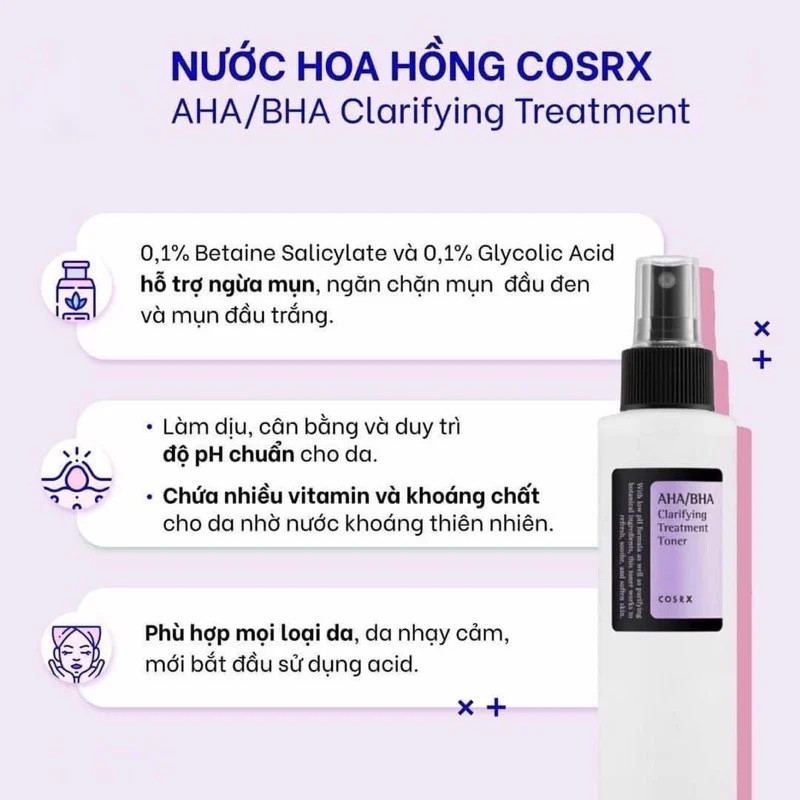 - Nước Hoa Hồng Hỗ Trợ Giảm Mụn, Tẩy Tế Bào Chết Hóa Học Cosrx AHA/BHA Clarifying Treatment Toner với công thức thành phần dịu nhẹ từ thiên nhiên giúp làm sạch lỗ chân lông, làm dịu, dưỡng ẩm cho làn da, kiểm soát tuyến bã nhờn, hỗ trợ sạch mụn và cải thiện bề mặt da mang lại làn da sáng khoẻ và đều màu.