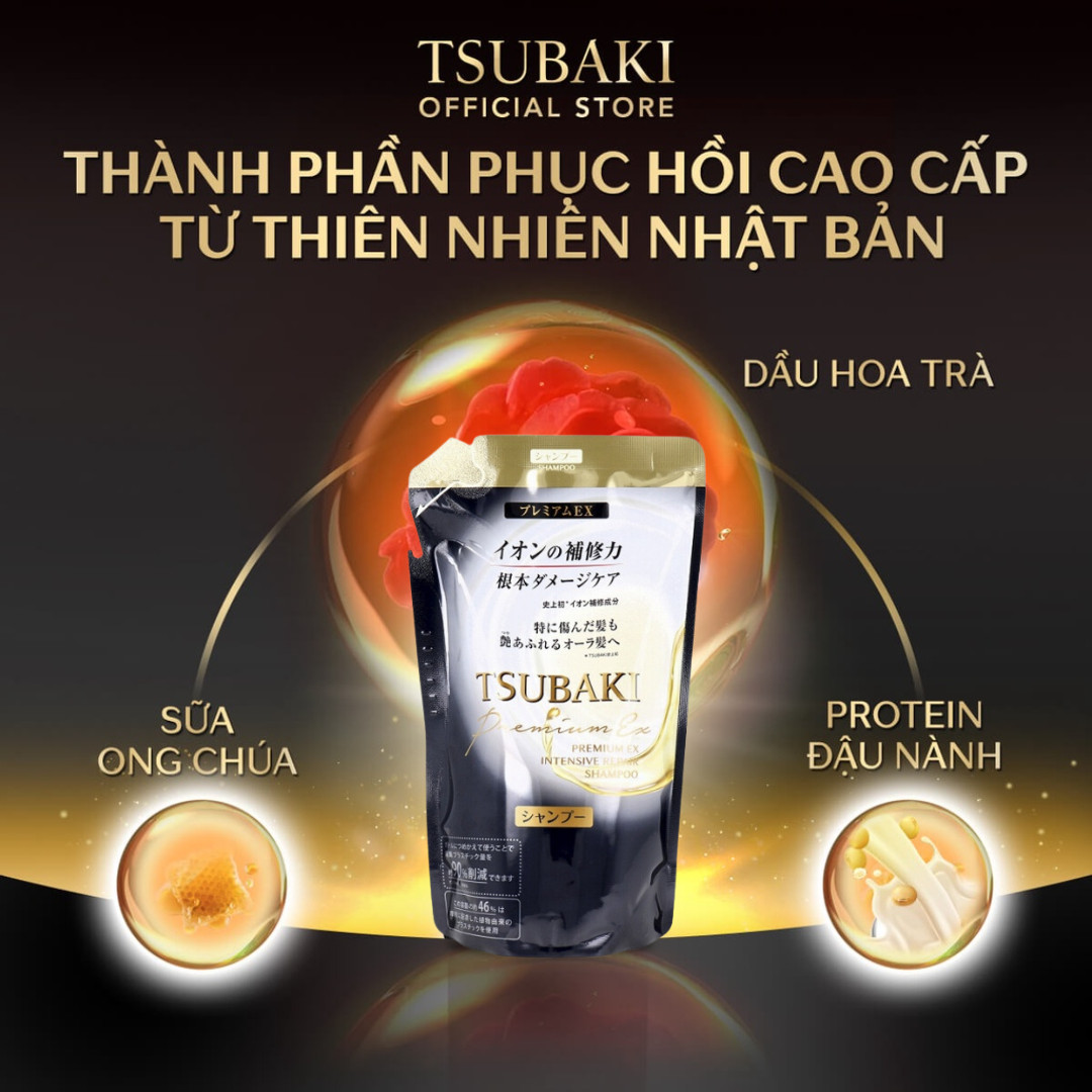 [Túi Refill] Dầu Gội Phục Hồi Chuyên Sâu Tsubaki Premium Ex Intensive Repair Shampoo 330ml là dầu gội với công thức bổ sung Ion phục hồi cùng thành phần thiên nhiên cao cấp như dầu hoa trà, sữa ong chúa, protein đậu nành giúp nuôi dưỡng và tái cấu trúc từng sợi tóc hư tổn do Uốn - Duỗi - Tẩy - Nhuộm.