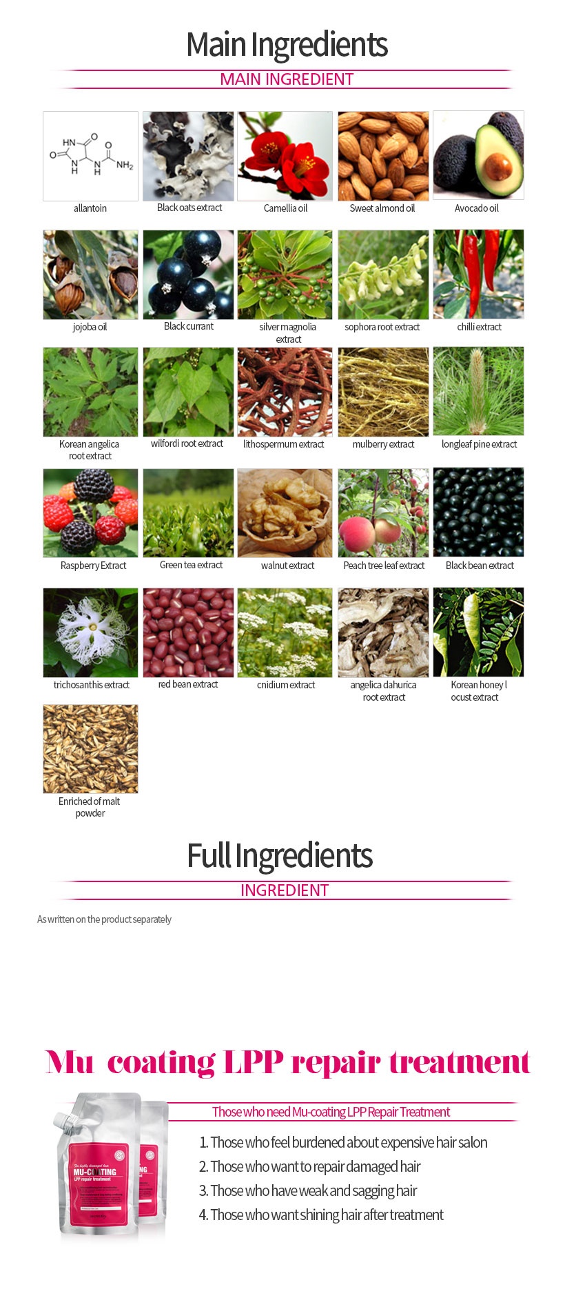 - Đồng thời, với công nghệ mới nhất trong ngành tóc, Professional Hair Care Mu-Coating Lpp Repair Treatment có khả năng phủ từng sợi tóc và tại được lớp màng vô hình bảo vệ mái tóc khỏi sự tác động từ môi trường ô nhiễm, ánh nắng, gió bụi và các thiết bị tạo kiểu tóc.