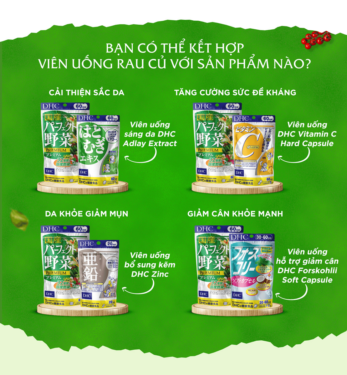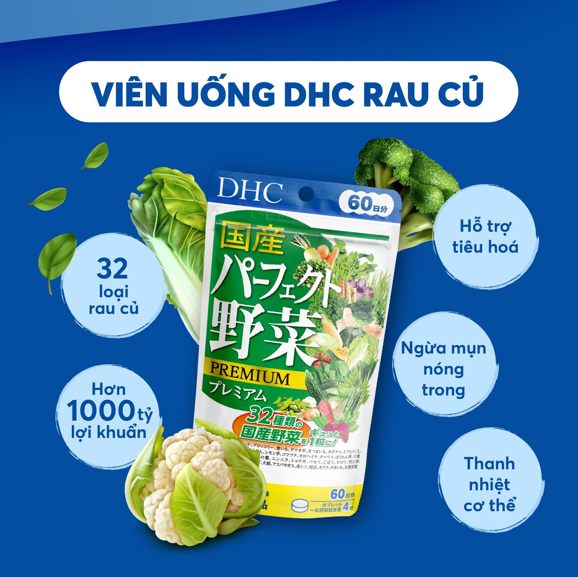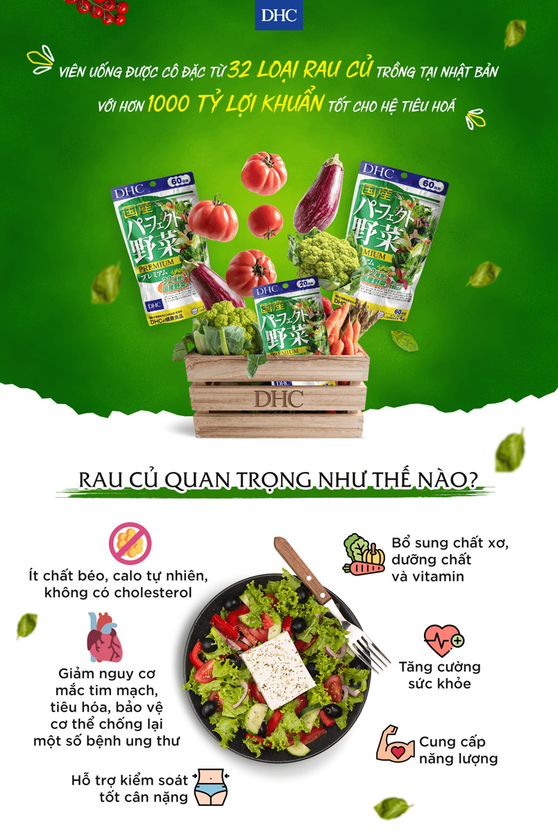 - Viên uống rau củ của DHC là loại thực phẩm chức năng bảo vệ sức khỏe có chứa thành phần cô đặc từ 32 loại rau củ chứa hàm lượng dinh dưỡng cao, giúp bạn bổ sung chất dinh dưỡng chỉ trong 1 lần uống. Sản phẩm chứa cả những loại rau củ mà bạn khó có thể mua ở chợ hay siêu thị, hay cả loại rau củ dễ dàng mua được nhưng lại gặp khó khăn trong chế biến,...