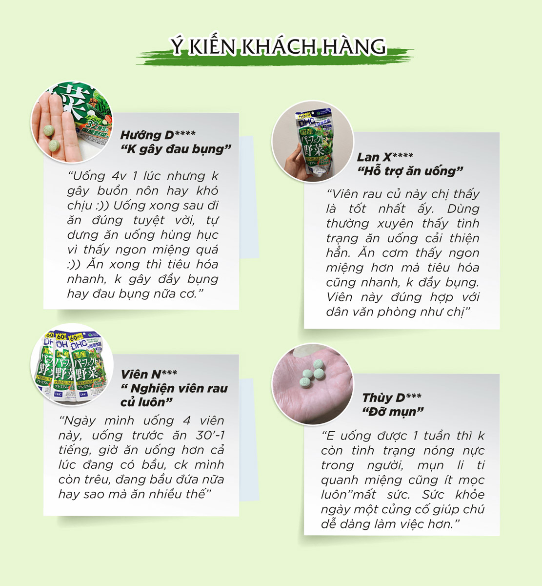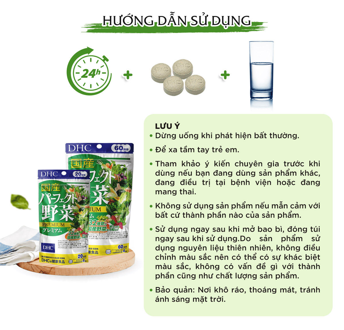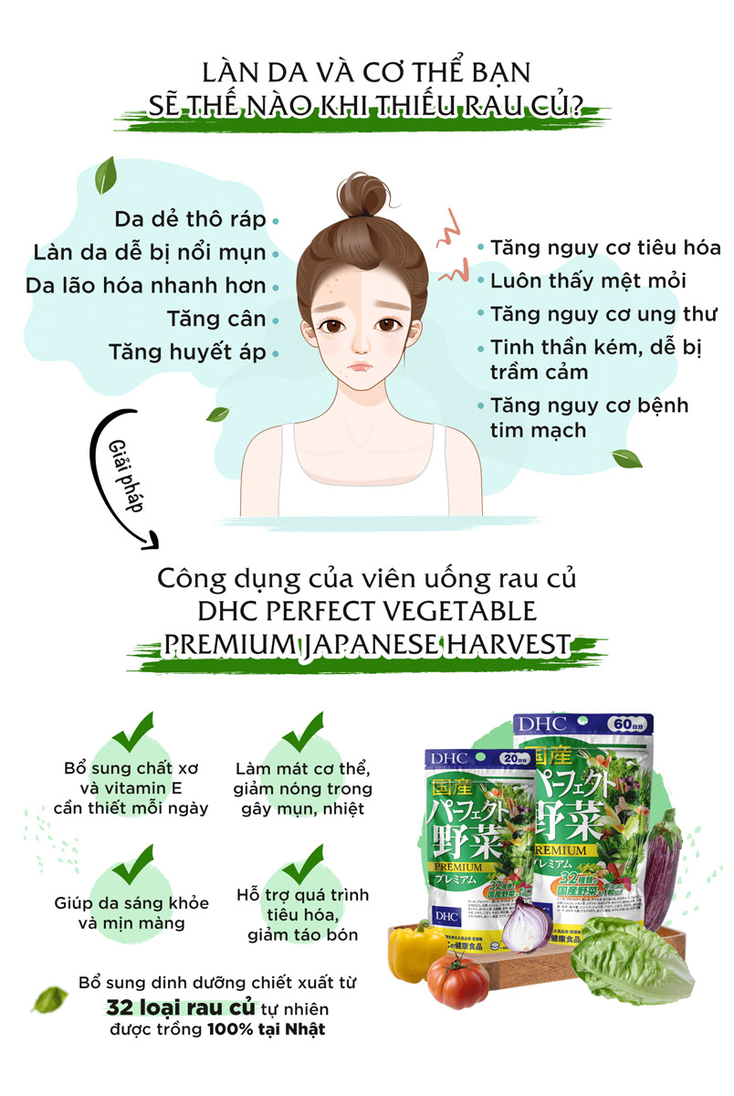 - Ngoài ra, viên uống rau củ DHC Perfect Vegetable còn được bổ sung thêm lợi khuẩn lactic, men và vitamin E, tất cả sẽ đem lại cho bạn một làn da khỏe mạnh. Chỉ với 4 viên uống mỗi ngày là bạn có thể cung cấp đầy đủ và hiệu quả lượng dinh dưỡng thiết yếu cho cơ thể, đặc biệt là đối với người thiếu hoặc lười ăn rau.