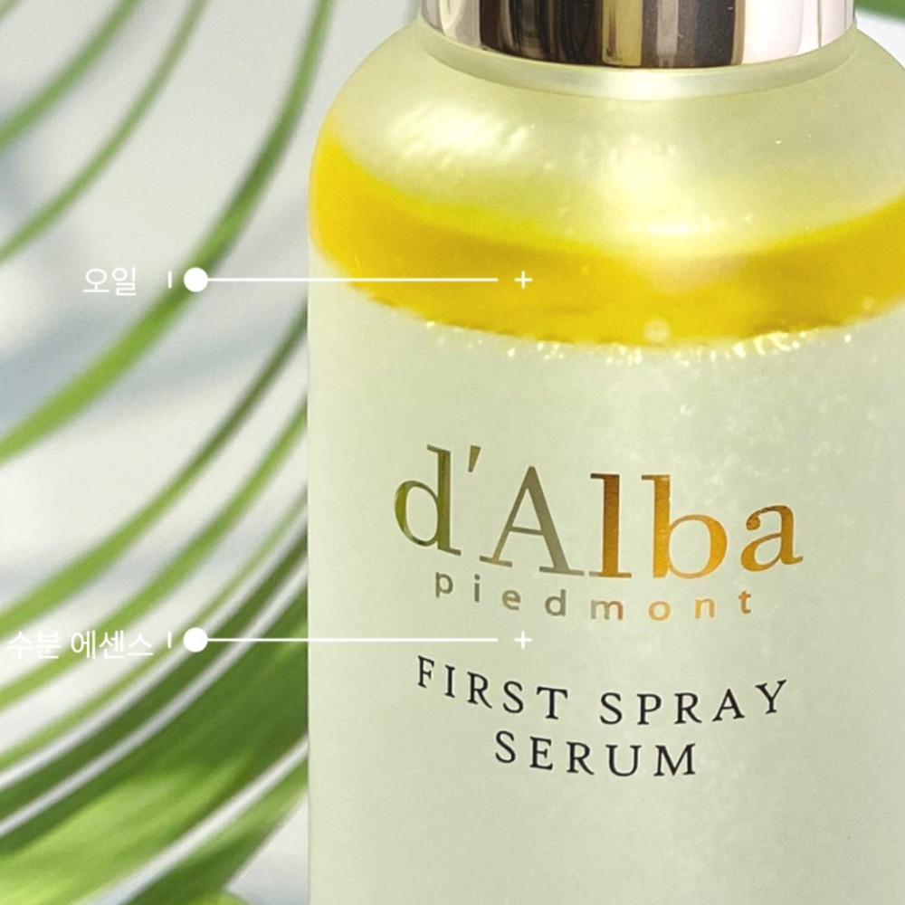 - D'alba White Truffle First Spray Serum dưỡng ẩm tức thì, được tách thành hai lớp: một lớp dầu xả (tinh chất) và một lớp kem dưỡng da (chất giữ ẩm). Sau khi lắc đều chai, hai lớp đặc tính pha trộn, nhanh chóng thấm sâu vào lỗ chân lông và dưỡng ẩm tức thì cho da.