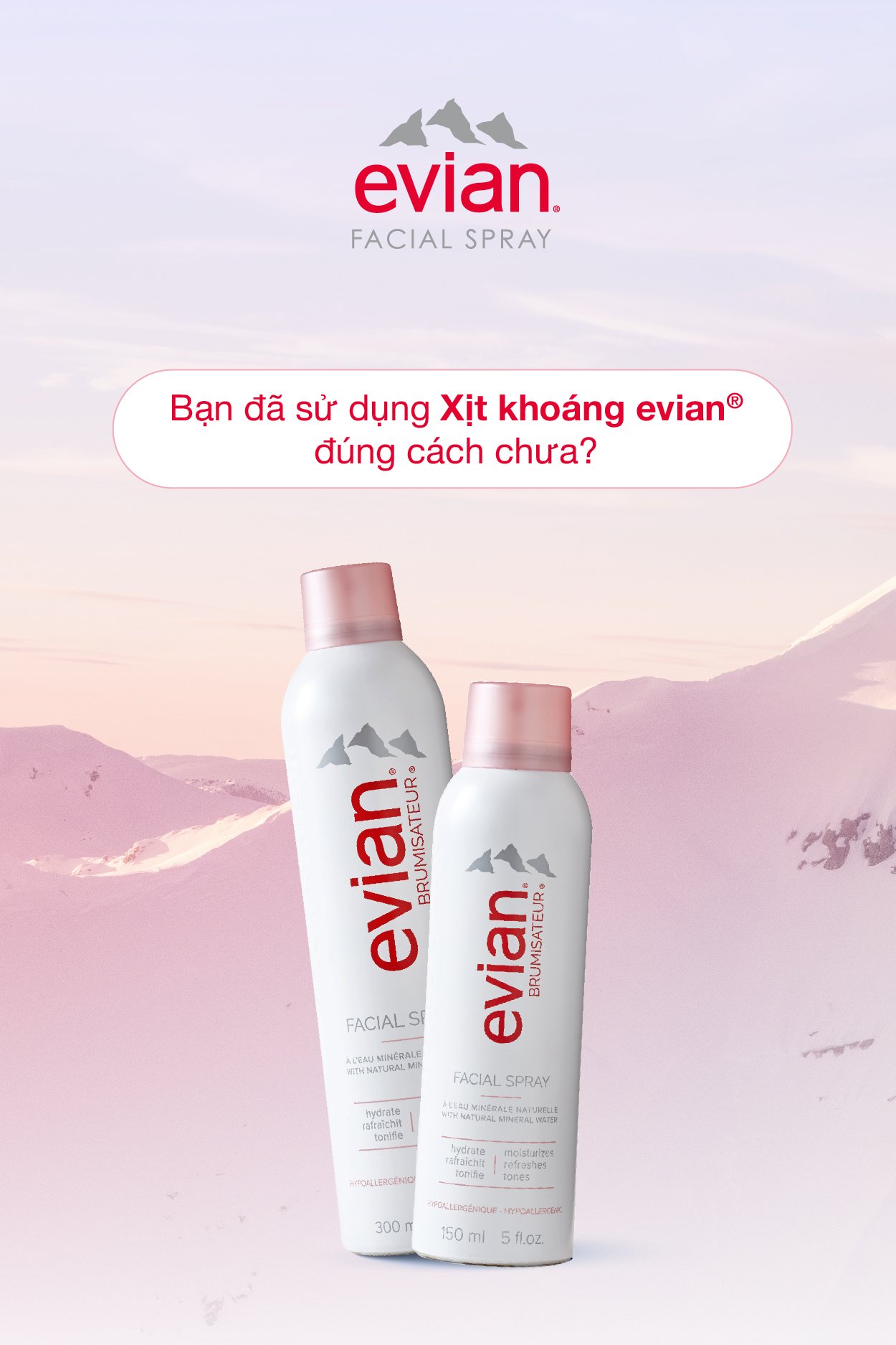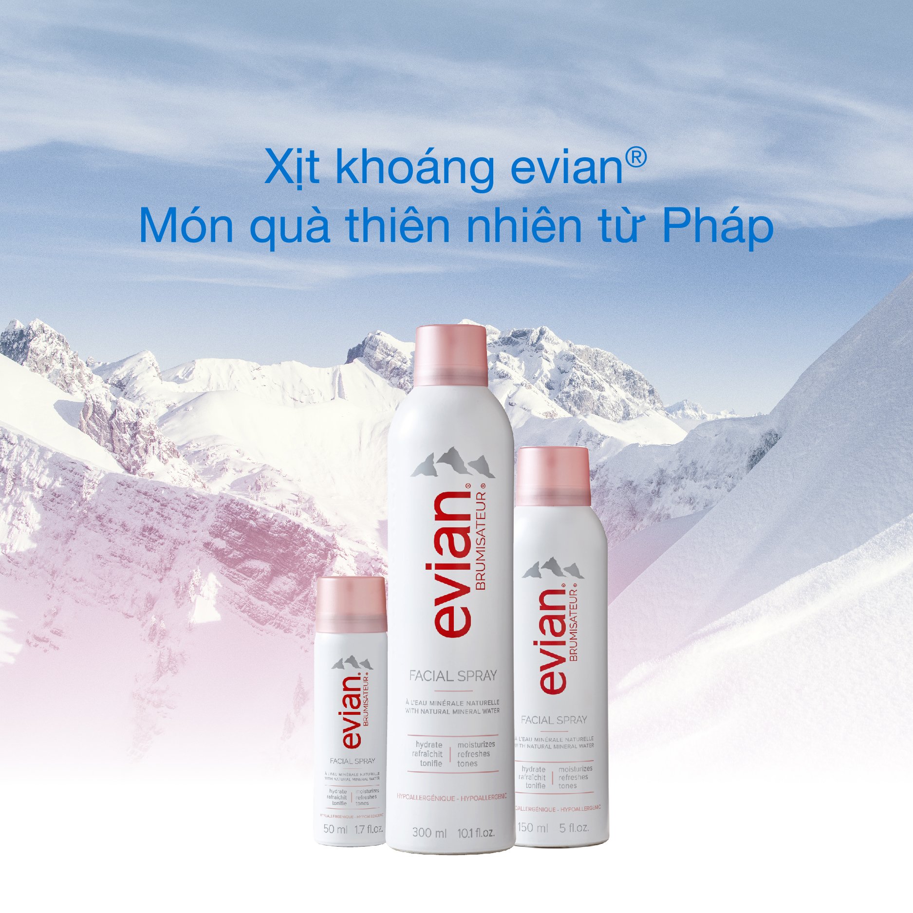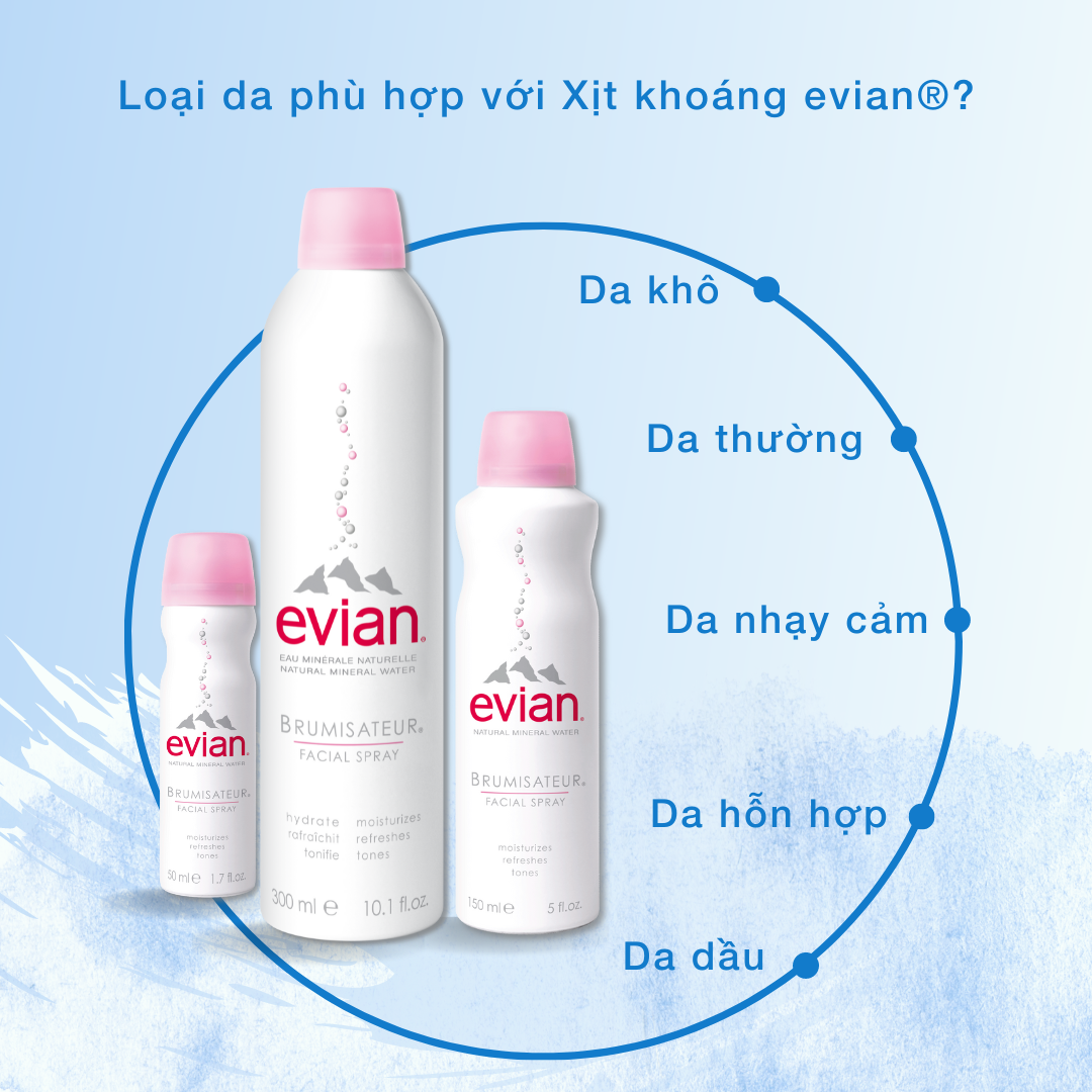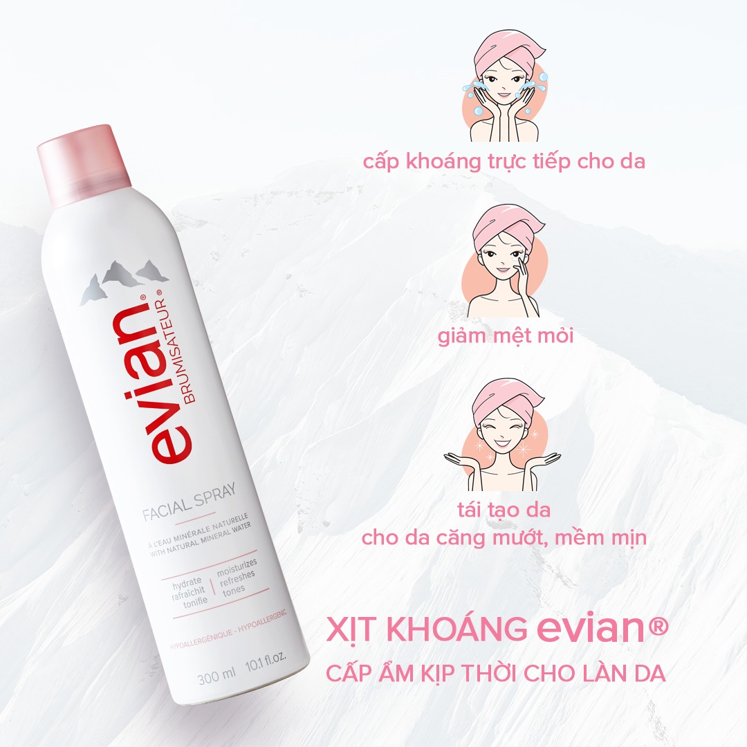 - Xịt khoáng Evian với thành phần chính là nước khoáng tinh khiết vô cùng lành tính, xịt khoáng Evian giúp làm dịu da tức thời. Cảm giác dễ chịu kéo dài vài giờ đồng hồ, lâu hơn hẳn so với các loại xịt khoáng thông thường. Xịt khoáng an toàn cho da tuyệt đối, bạn có thể hoàn toàn tin tưởng và an tâm vào chất lượng sản phẩm từ thương hiệu Evian.