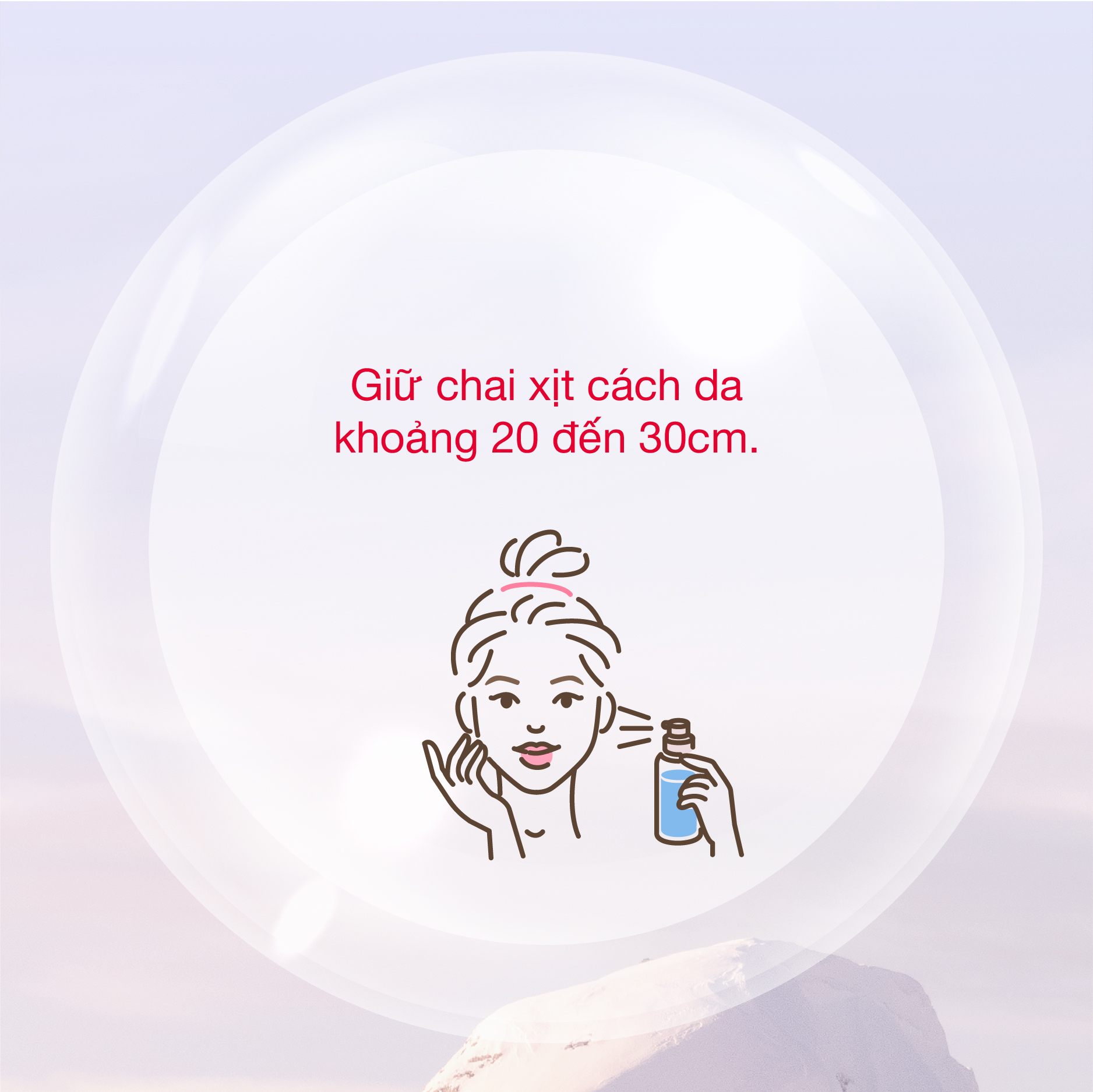 Bước 1: Giữ xịt khoáng song song với khuôn mặt, cách khoảng 20 - 30cm tùy vào mục đích sử dụng.